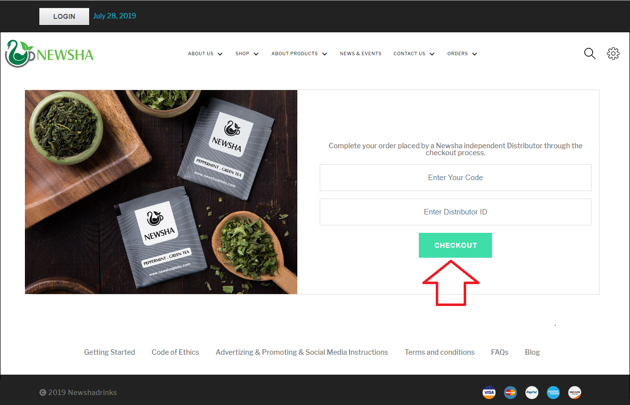 2. They will enter the PI number and Newsha Distributor ID in their related fields and press “Checkout”.